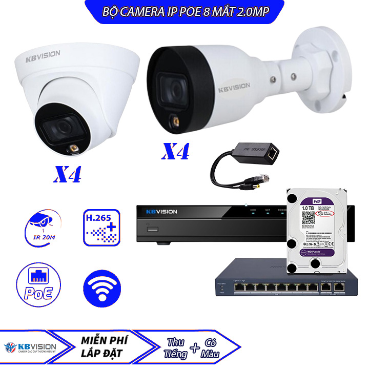 Combo lắp ráp trọn gói Bộ 8 Camera KBvision IP POE 2.0MP – Thu Tiếng – Có Màu. Hỗ trợ lắp đặt tận nhà trọn gói